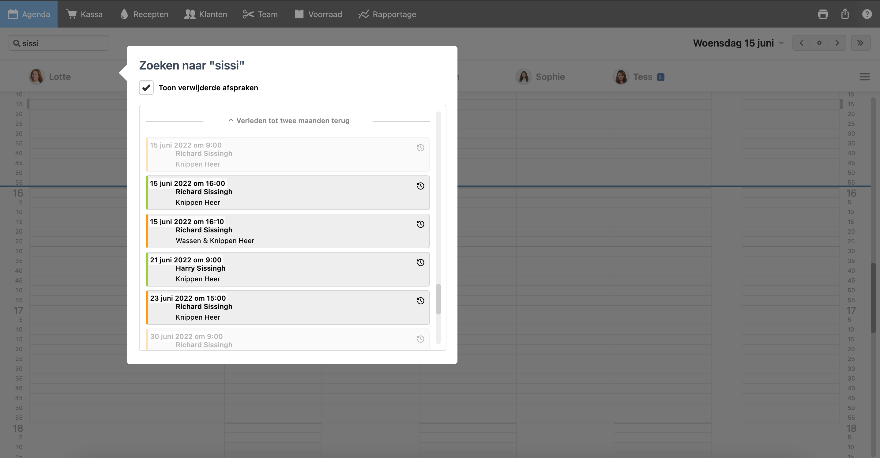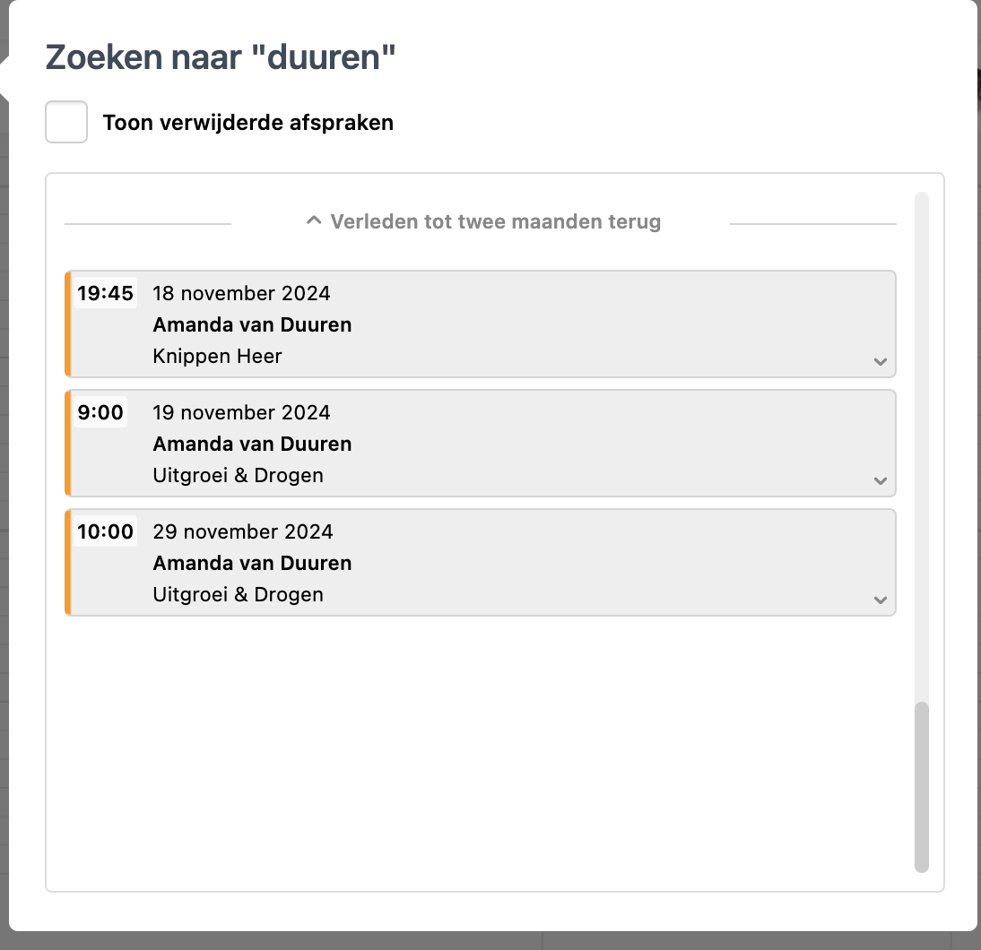 Deze afspraken bevatten de volledige wijzigingsgeschiedenis. Zo kun je zien of de afspraak door de salon is verwijderd of door de klant zelf.