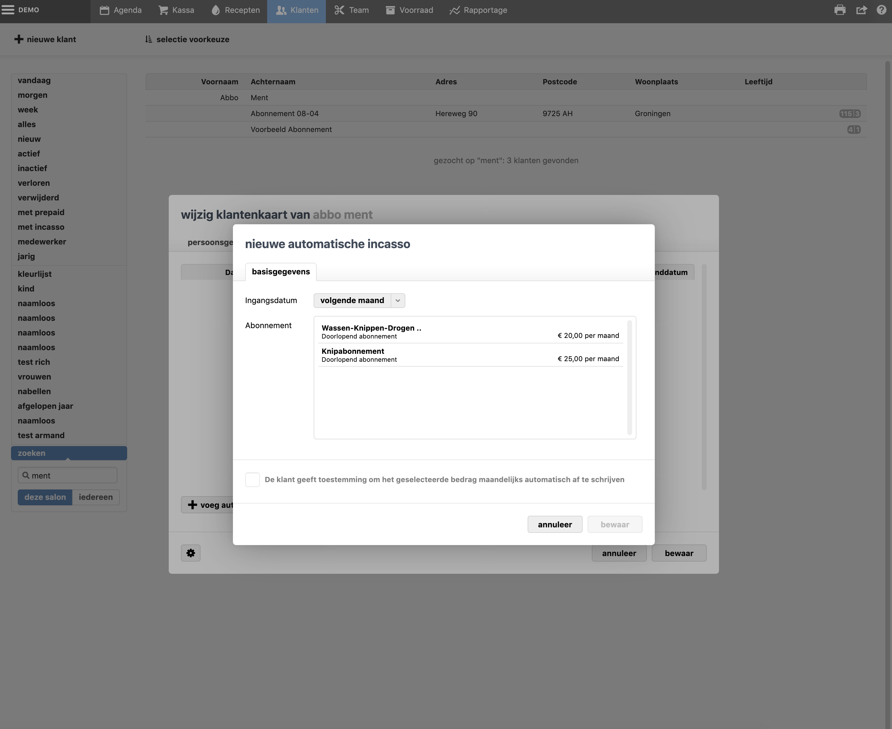Selecteer de medewerker en klant, klik op ‘Abonnement’ en kies het maandabonnement. Vul het IBAN en de tenaamstelling in het pop-up venster in. Vink de checkbox aan voor incassotoestemming en bevestig. Het maandbedrag blijft openstaan in het kassascherm.
