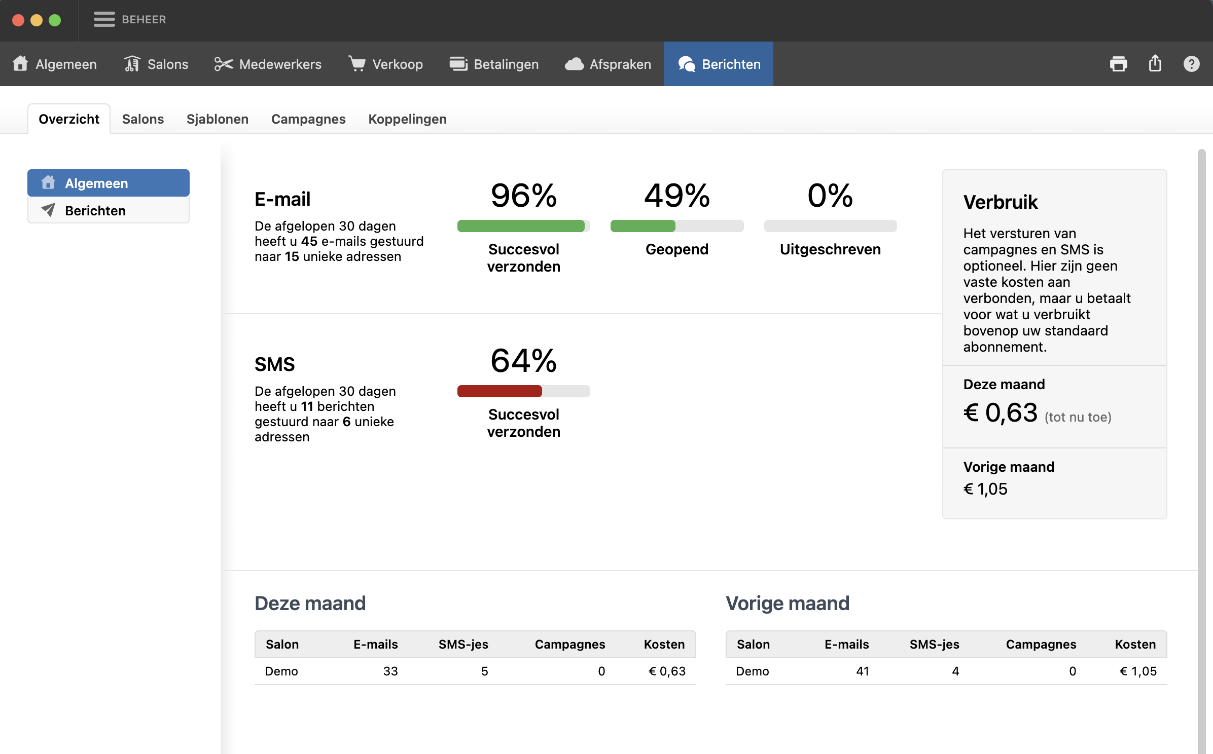 Bovendien kun je per salon bekijken hoeveel e-mails, SMS’jes en campagnes zijn verstuurd. Tot slot zie je duidelijk wat de bijbehorende kosten zijn.
