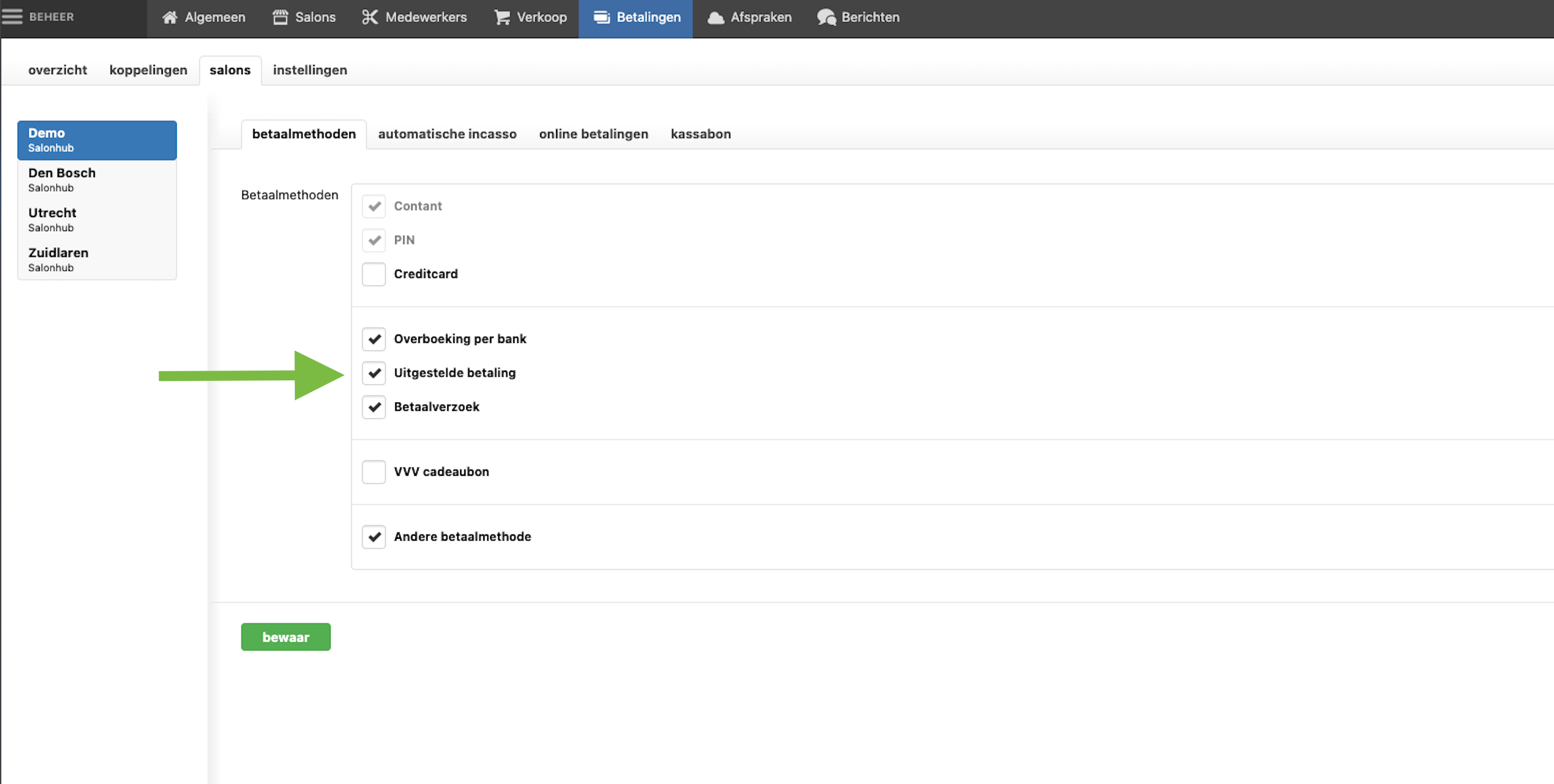 Als betalen via een betaalverzoek nog niet beschikbaar is in de kassa, kun je deze optie eenvoudig activeren via het beheermenu. Ga naar Beheer > Betalingen en selecteer het submenu Salons. Hier zie je een overzicht van de beschikbare betaalmethoden. Zet een vinkje bij Betaalverzoek en klik op Bewaar. De betaalmethode wordt direct toegevoegd aan de kassa.