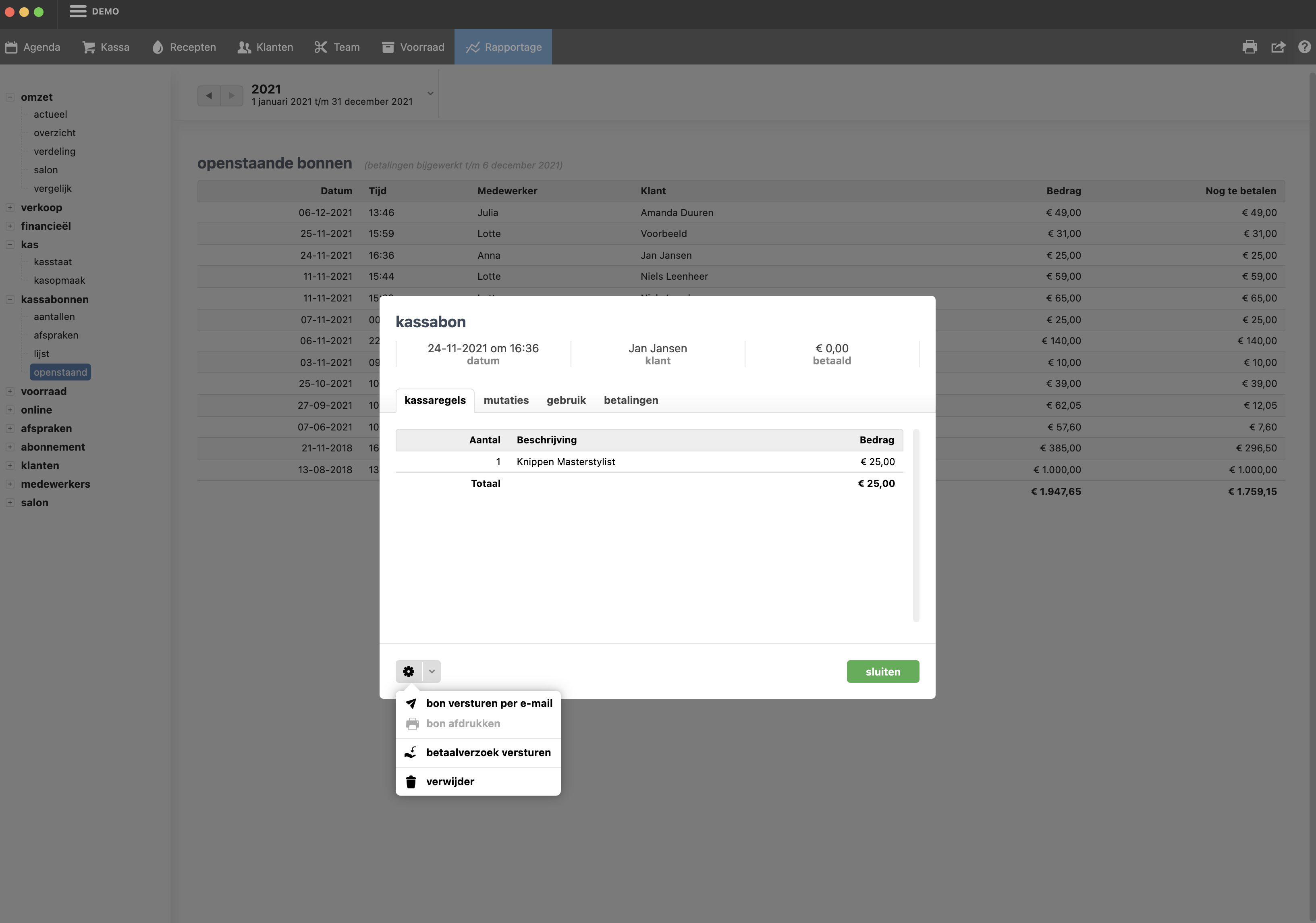 Daarnaast biedt kassabonnen ook nog een lijst met openstaande bonnen. Via dit overzicht kan een betaalverzoek worden verzonden, zoals in het onderstaande voorbeeld wordt gedaan: