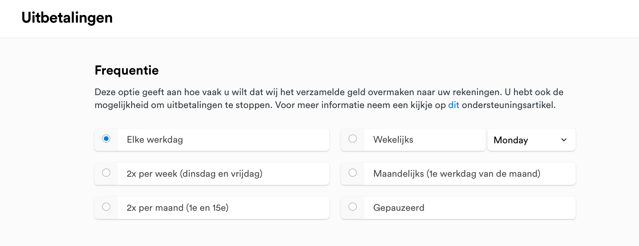 Daarnaast kan ook de frequentie van uitbetalen worden ingesteld. In het onderstaande voorbeeld is ingesteld dat er dagelijks wordt uitbetaald. Deze frequentie kan eenvoudig worden aangepast.