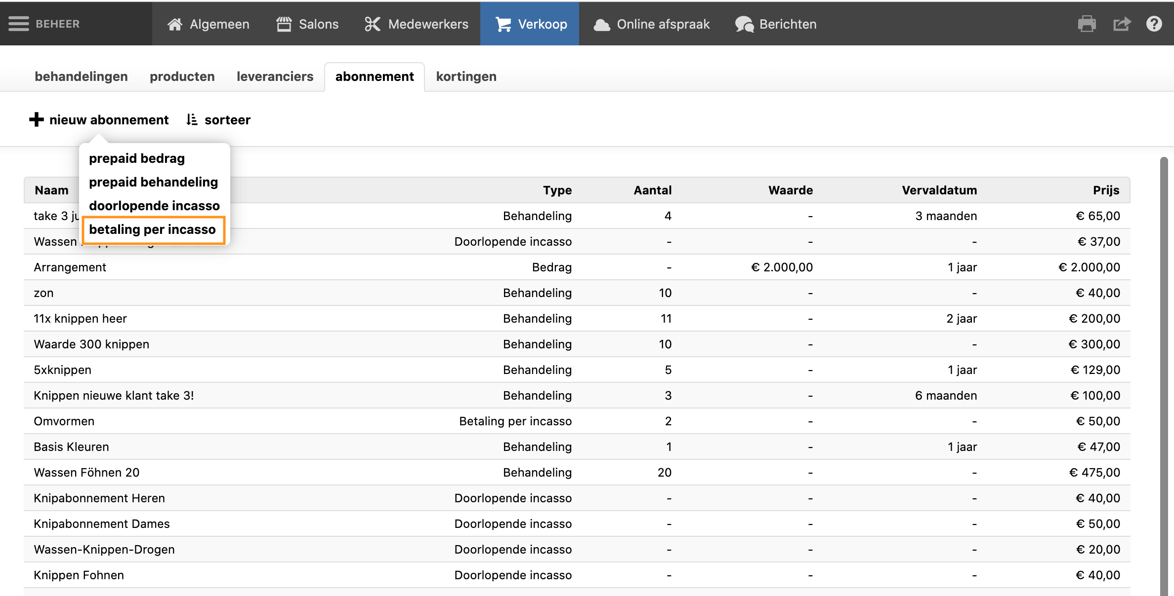 Bij Beheer-Verkoop-Abonnement kies voor nieuw abonnement en voor de optie betaling per incasso: