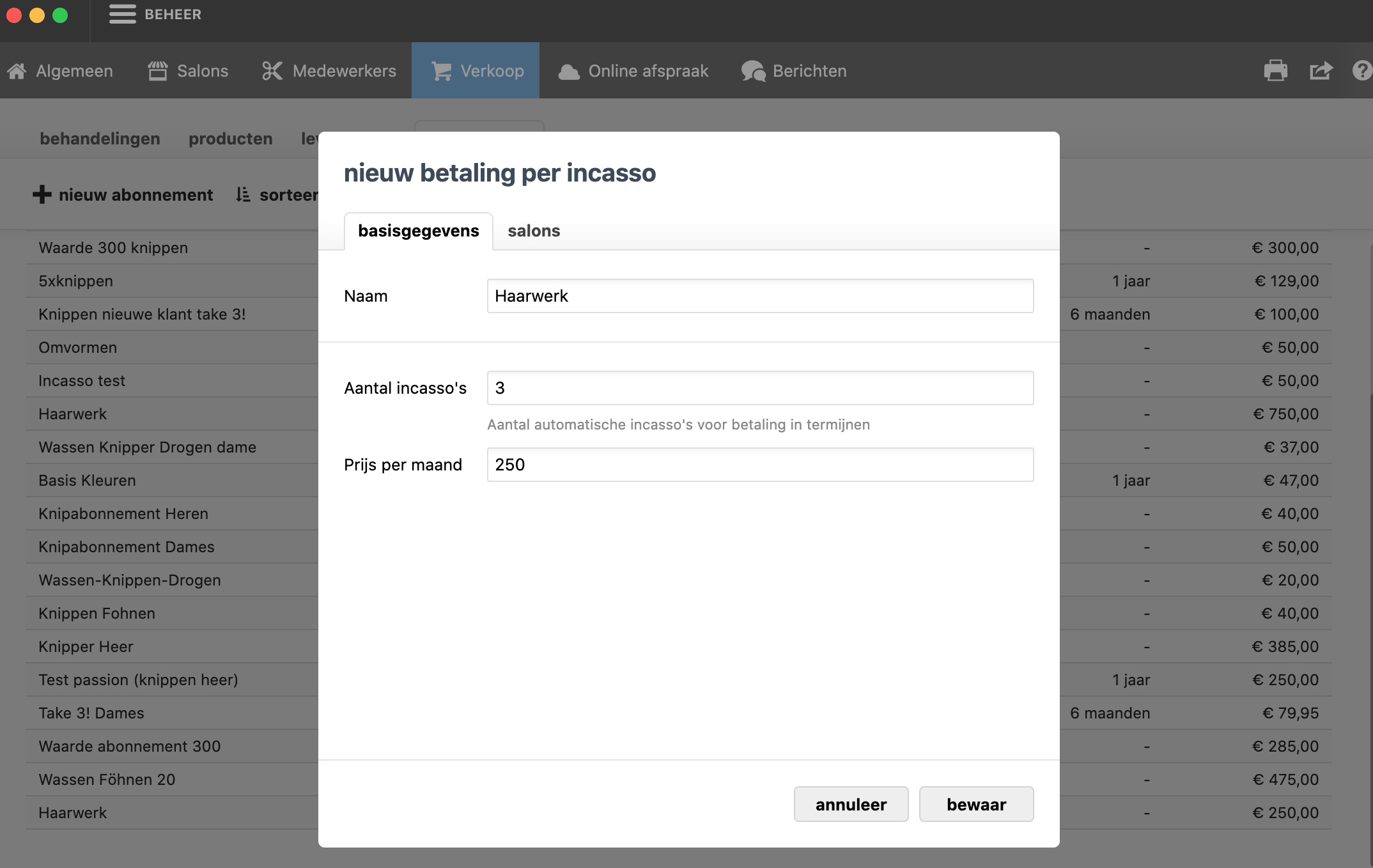 Geef de incasso een naam: bijvoorbeeld Haarwerk. Voer het aantal keren in waarin het bedrag per maand wordt geïncasseerd en vul het bedrag in en bewaar.