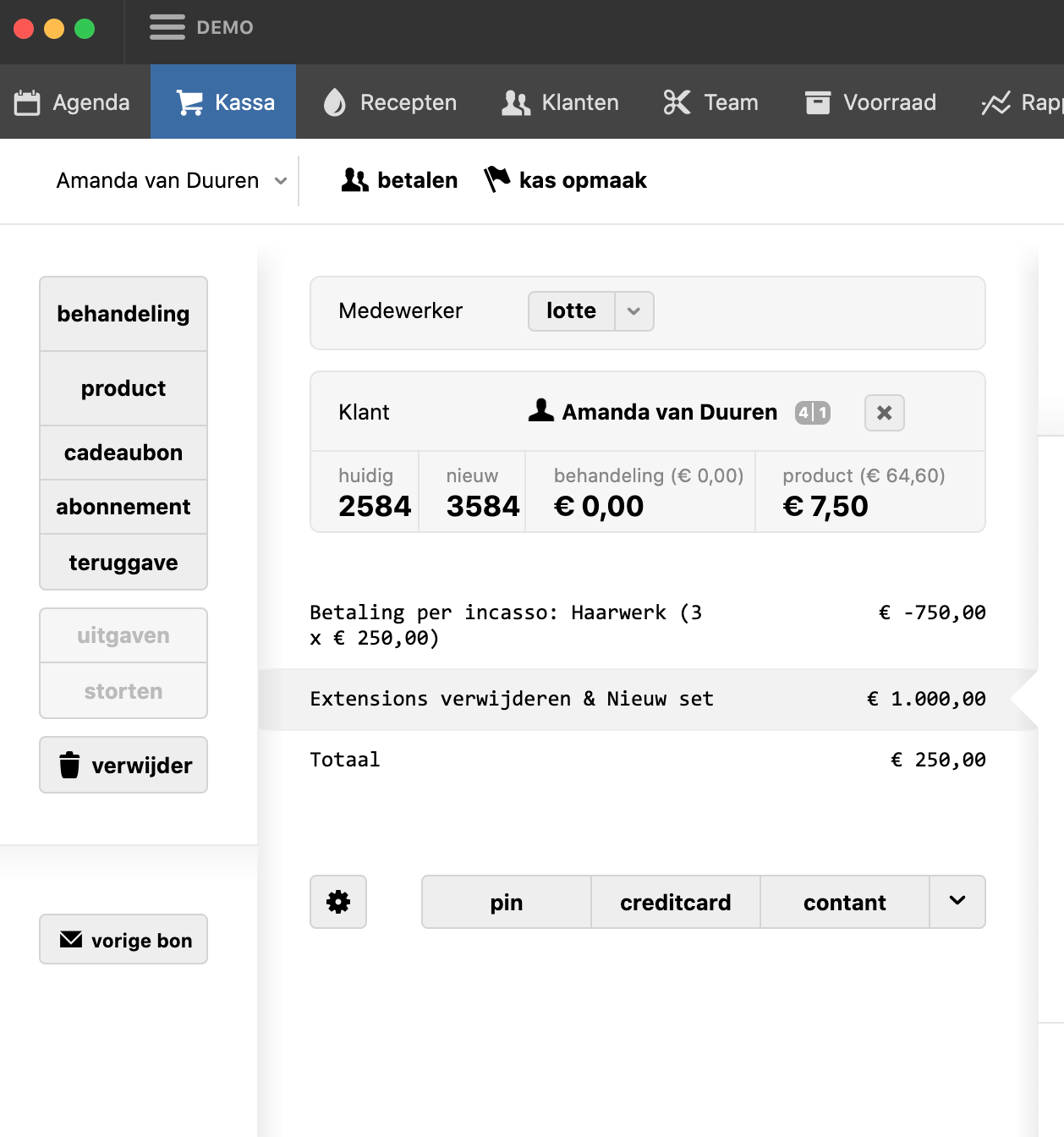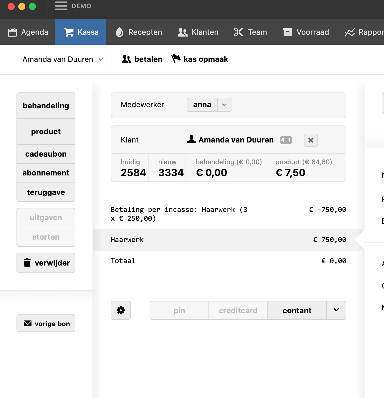 Het is ook mogelijk om een automatische incasso in termijnen op deze manier aan de klantenkaart toe te voegen, zonder dat er direct een behandeling of product wordt afgerekend. Dit biedt flexibiliteit voor klanten om bedragen gespreid te betalen