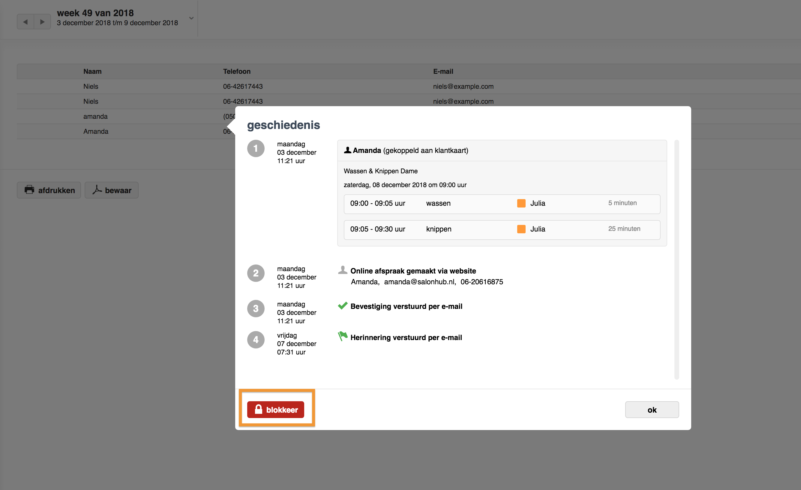 De functie Blokkeren is bedoeld om klanten die misbruik maken van online boekingen uit te sluiten van deze optie. In de agenda van de salon zelf kan de klant nog steeds worden ingepland.