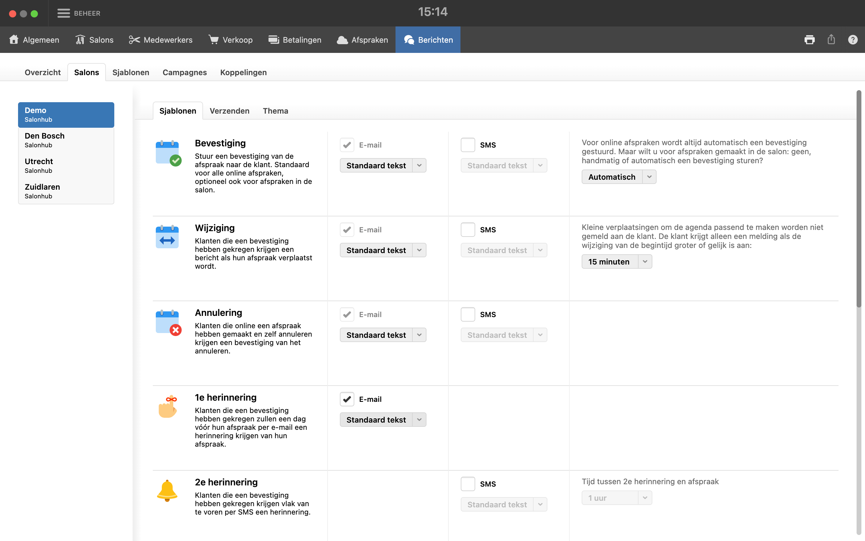 Nee, de e-mail- en sms-instellingen gelden voor alle afspraken in je salon. Je kunt wel verschillende sjablonen maken en deze per berichttype koppelen.