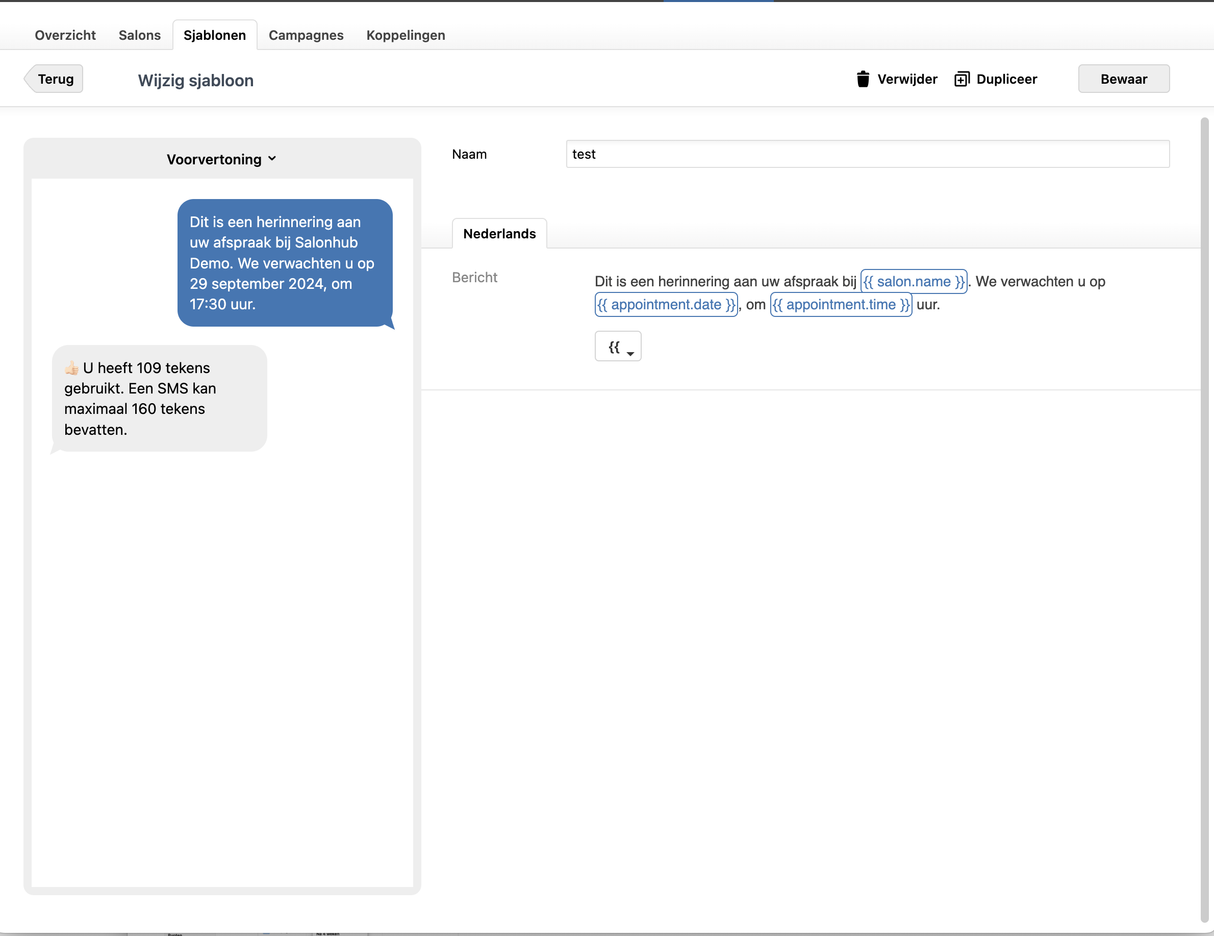 Een sms heeft beperkte ruimte. Gebruik alleen de belangrijkste informatie zoals datum, tijd en salonnaam. Lange berichten worden opgesplitst en kosten meer credits.