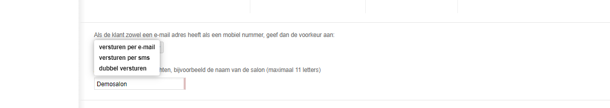 Er kan gekozen worden voor dubbel versturen, of enkel versturen. Bij dubbel wordt het standaard zowel per e-mail als per sms verstuurd. Bij enkel versturen per sms stuurt Salonhub in eerste instantie alleen een sms, maar als er geen nummer bekend is wordt alsnog een e-mail verstuurd.
