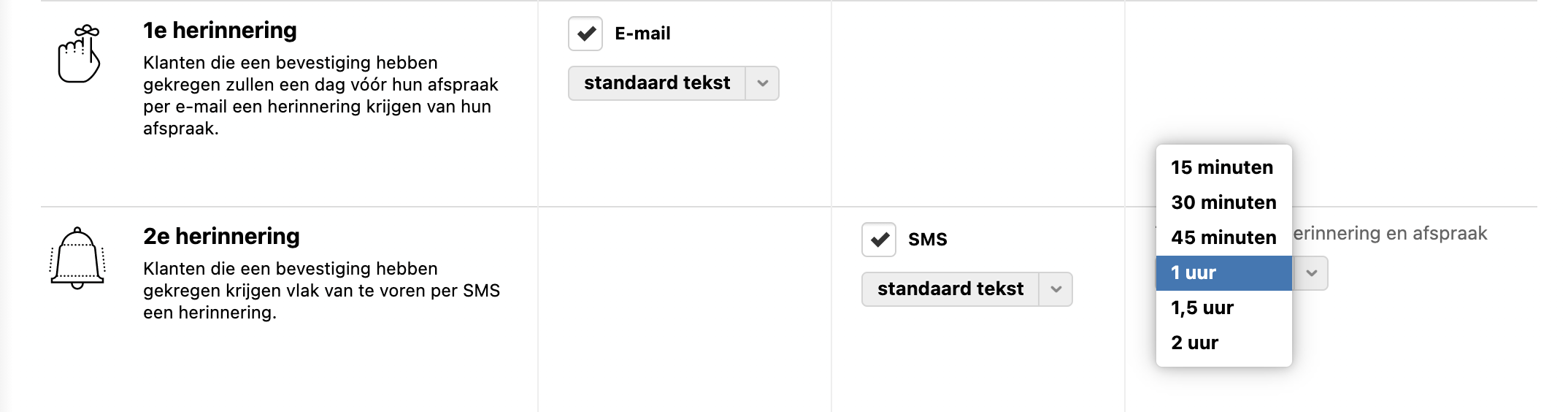 De sms-herinnering kun je instellen op 2 uur, 1,5 uur, 1 uur, 45 minuten, 30 minuten of 15 minuten voor aanvang van de afspraak. De e-mail herinnering wordt een dagdeel voor de afspraak verstuurd.