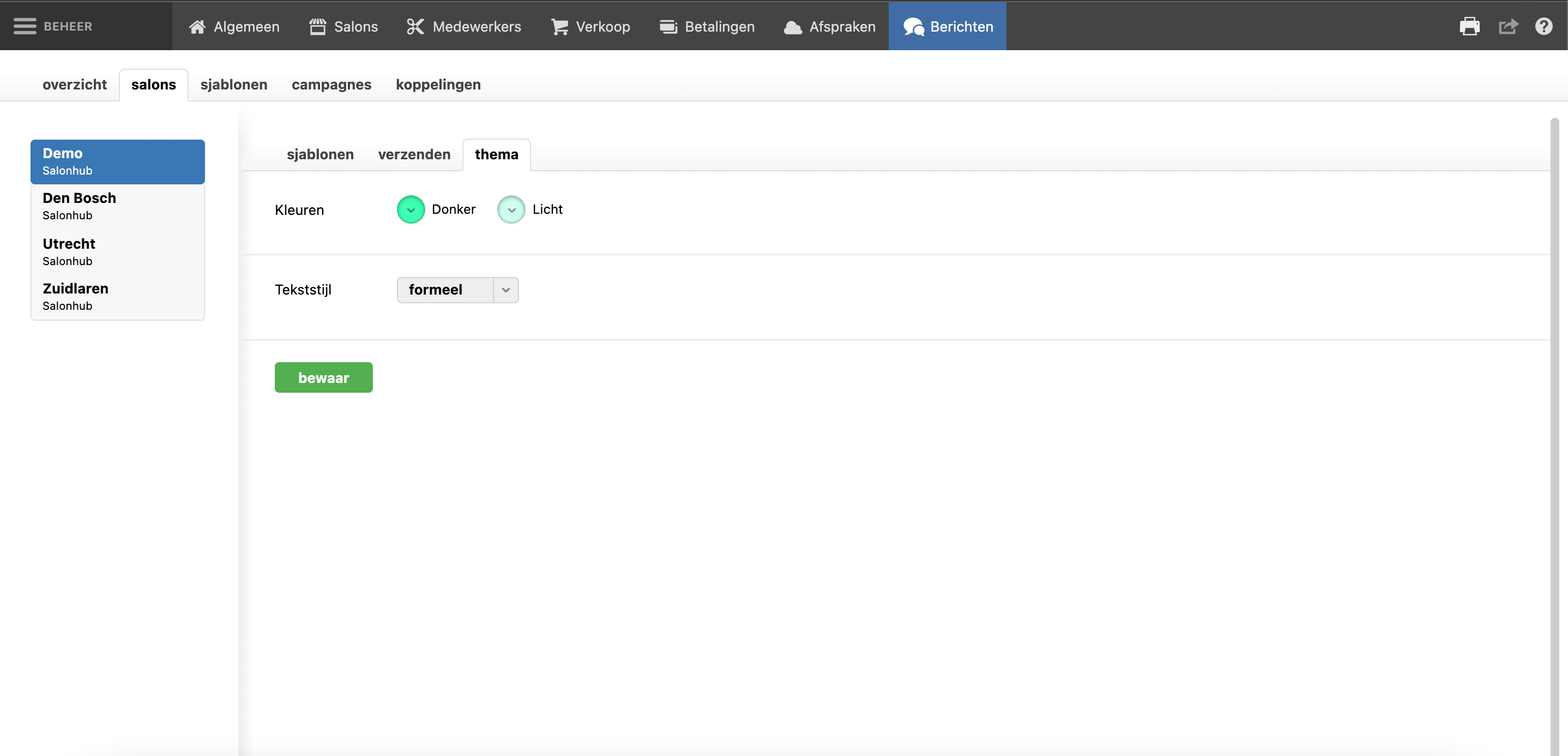Het veranderen van formeel naar informeel kan via beheer – berichten – salons – thema, zoals in het onderstaande voorbeeld is weergegeven. Hier kan ook de kleur van de mail worden gewijzigd (licht of donker).
