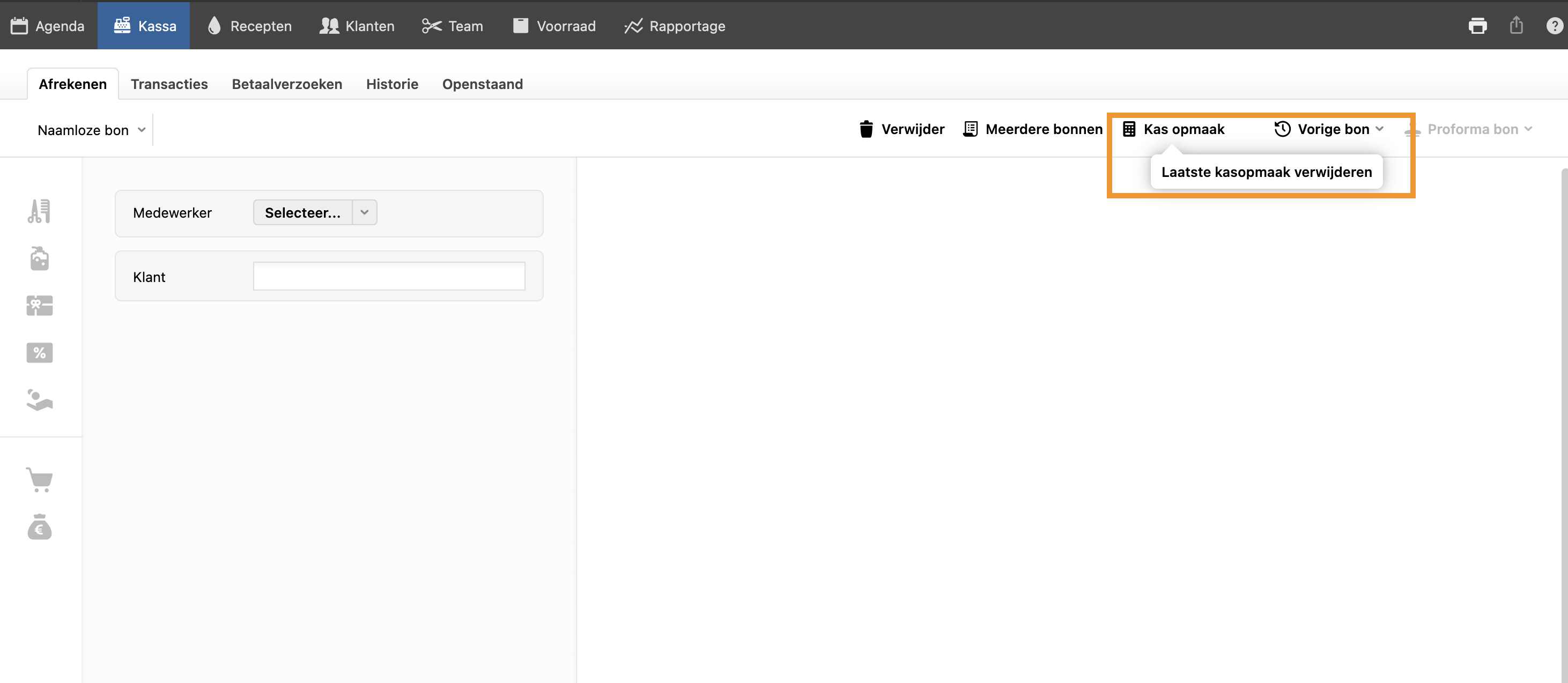 Een kasopmaak verwijderen kan op het moment dat er nog geen nieuwe bonnen zijn aangemaakt. Ga naar kassa, klik met de rechtermuisknop op de knop kasopmaak en verwijder de laatste kasopmaak.