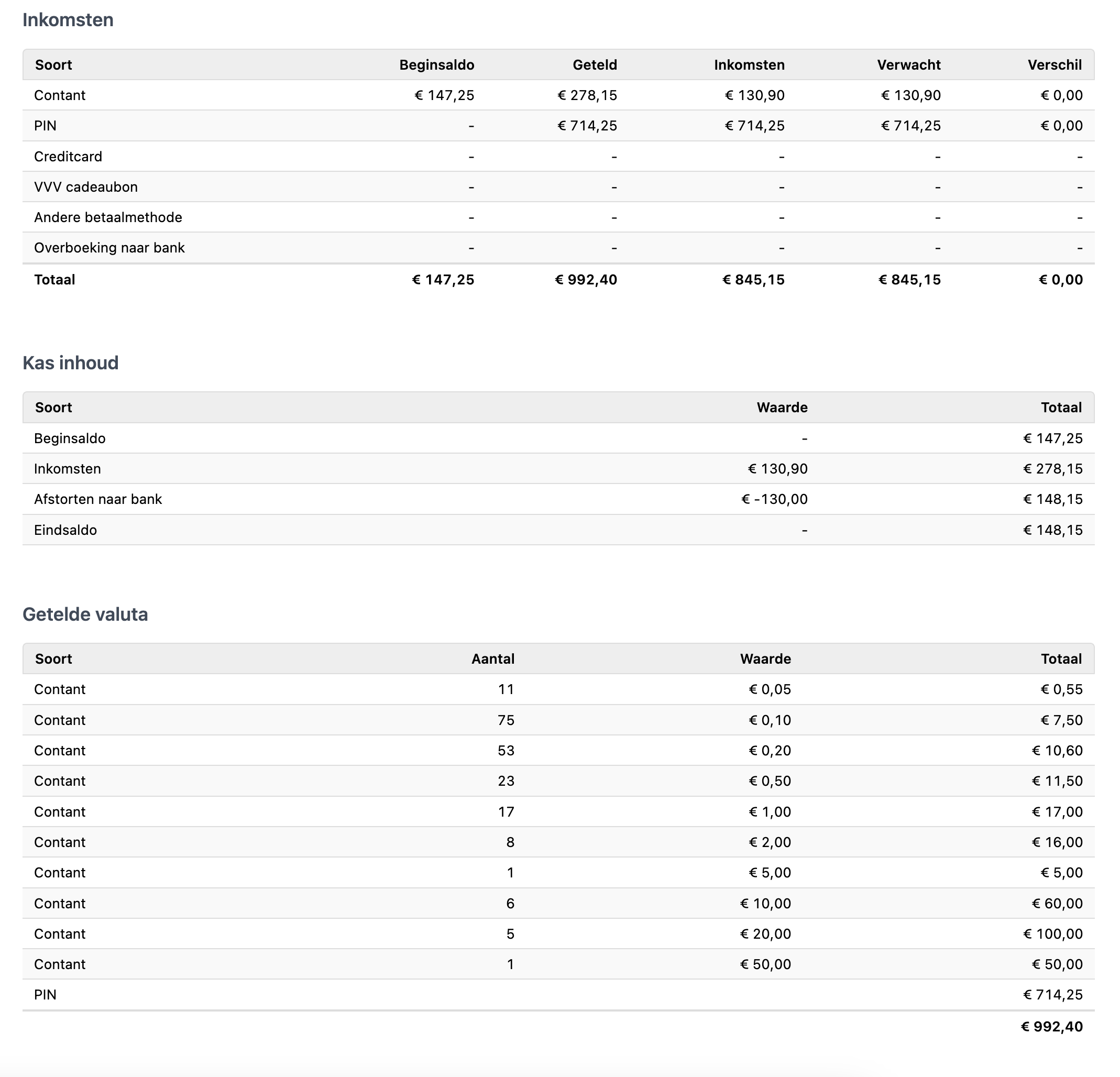 Deze rapportage wordt per dag gegenereerd als de kasopmaak is gedaan en is ondersteunend ter controle bedoeld. Voor het verwerken in de boekhouding adviseren we om de kasstaat te gebruiken.