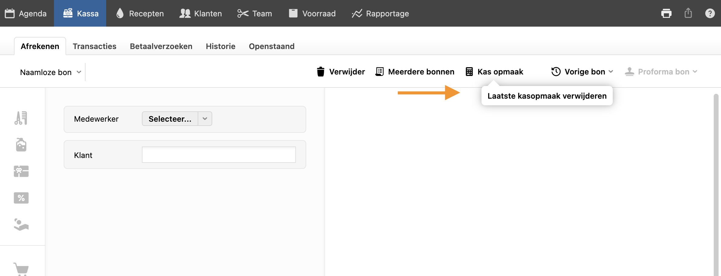 Het verwijderen van een kasopmaak is mogelijk zolang er geen nieuwe bonnen zijn aangemaakt.