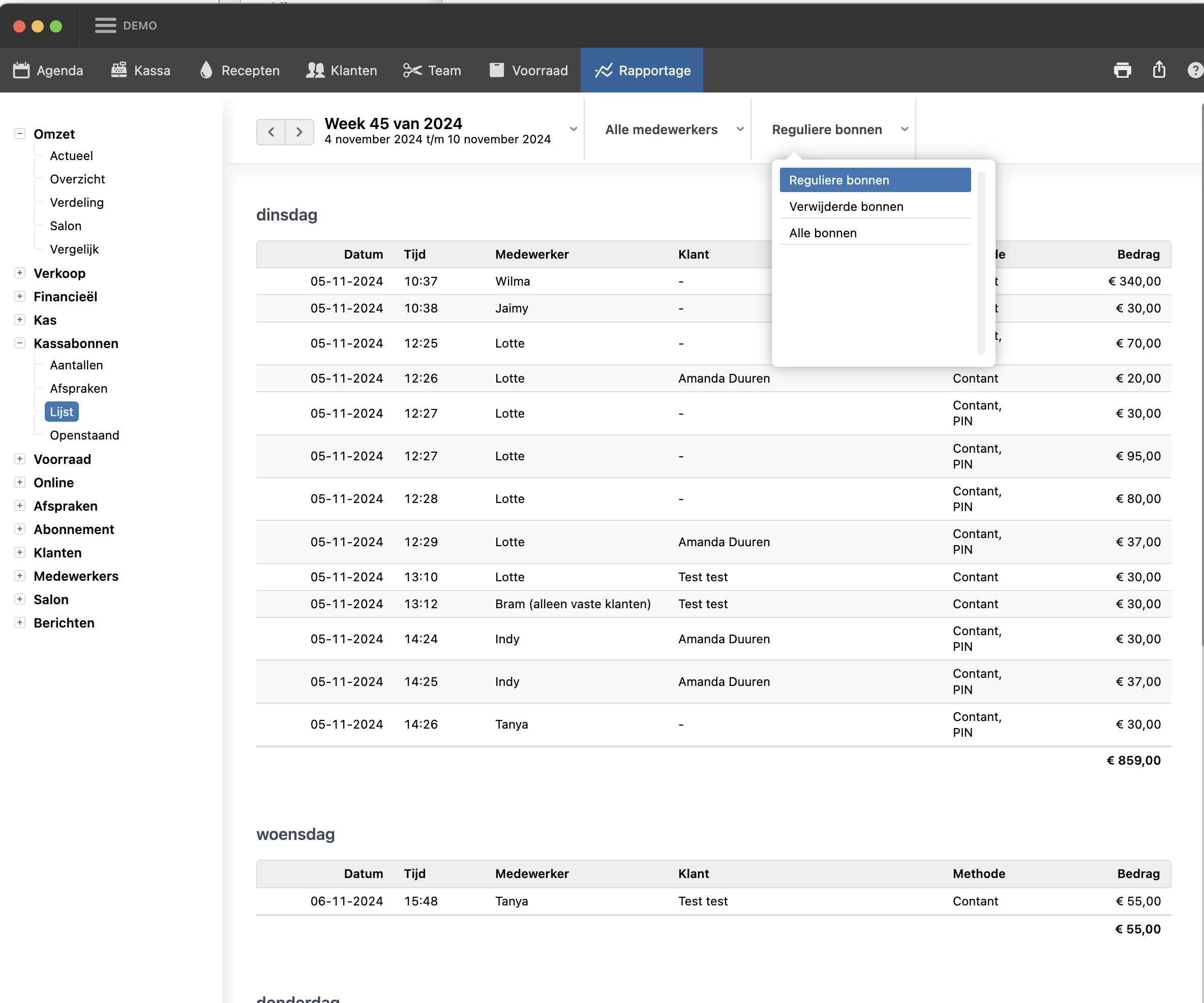 Zoom in op een specifieke medewerker door deze bovenaan te selecteren. Er kan ook gekozen worden voor verwijderde bonnen of een combinatie van regulieren bonnen en verwijderde bonnen.