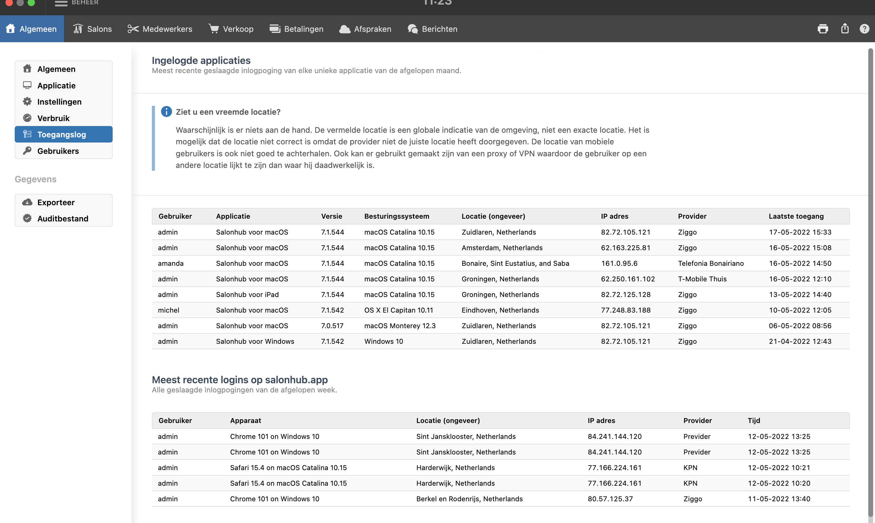 Een log is aangemaakt om een duidelijk overzicht te bieden van waar en wanneer er in het Salonhub-systeem is ingelogd. Dit overzicht toont eenvoudig de inloginformatie, waaronder het tijdstip, de gebruiker en het systeem waarmee is ingelogd.