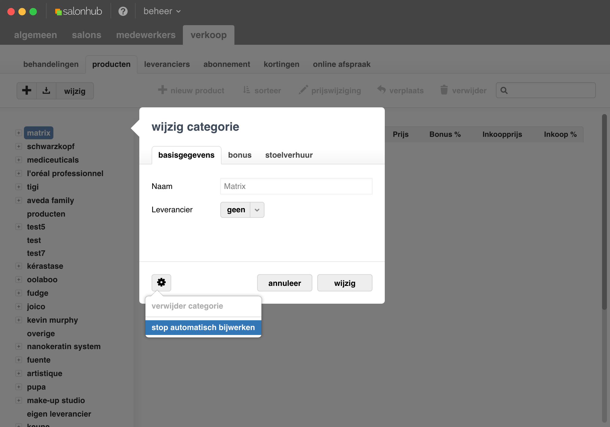 Als de salon de producten liever zelf beheert, kan deze losgekoppeld worden van de centrale productdatabase.