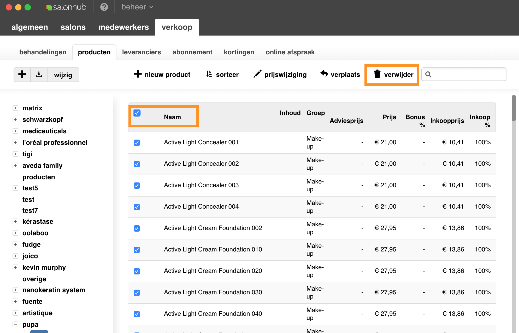 Selecteer een categorie en vink het selectievakje linksboven in de grijze balk aan. Hiermee worden alle producten in die categorie geselecteerd. Verwijder de geselecteerde producten vervolgens door op het prullenbakicoon te klikken.