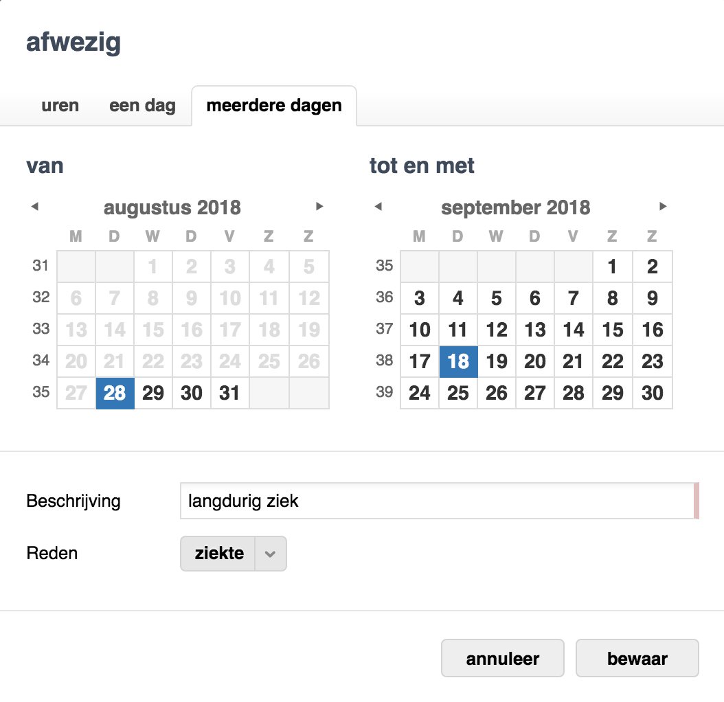 Ga naar Team, selecteer de medewerker, en kies Afwezig melden. Ga naar het tabblad Meerdere dagen en geef een geschatte duur op, bijvoorbeeld drie weken. De afwezigheid blijft zichtbaar in de lijst met afwezigheidsmeldingen. Zodra er meer duidelijkheid is, open de melding en pas de einddatum aan.