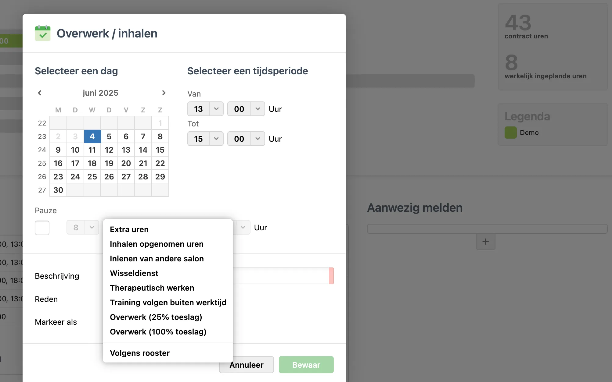 Als een medewerker tijdens ziekte weer begint met opbouwen, vallen deze uren onder arbeidstherapeutisch werken. Deze uren moeten per werkdag worden ingevoerd via aanwezig melden. Zo worden de ziekte-uren correct geregistreerd en is de medewerker zichtbaar en inzetbaar in de agenda.