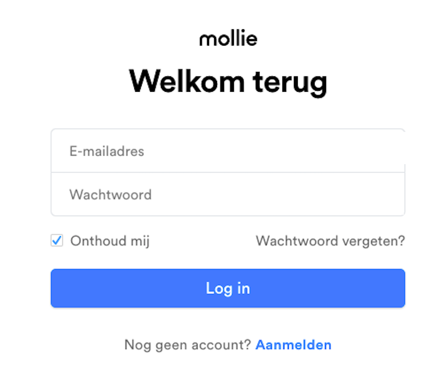 - Hier kan worden gekozen om in te loggen bij Mollie (mits er een actief account aanwezig is) of voor de optie ‘Aanmelden’, onderin naast de vraag ‘Nog geen account?’