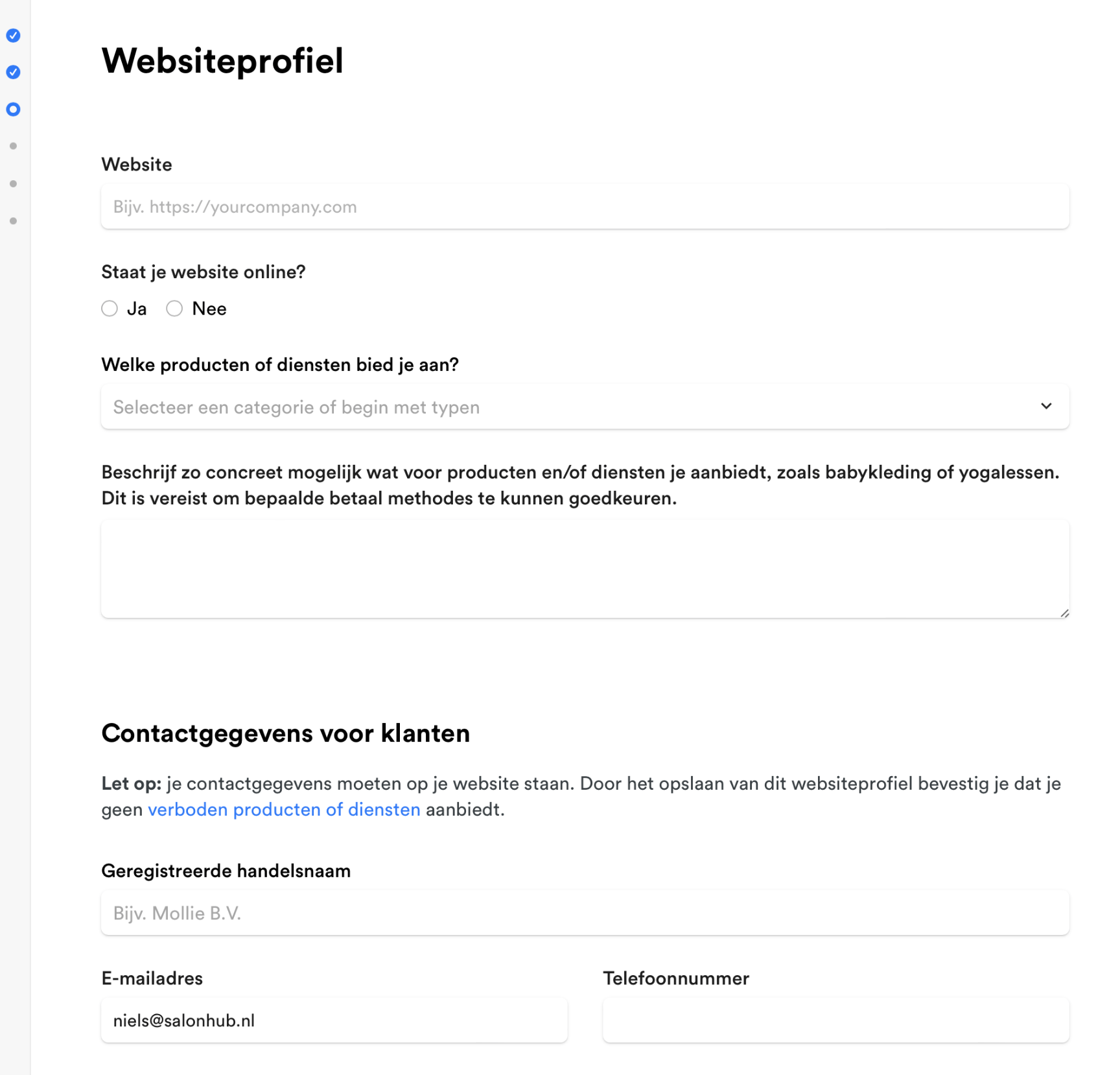 Er wordt tijdens het registreren om een ‘websiteprofiel’ gevraagd. Deze hoeft niet ingevuld te worden, aangezien binnen Salonhub een websiteprofiel wordt aangemaakt.