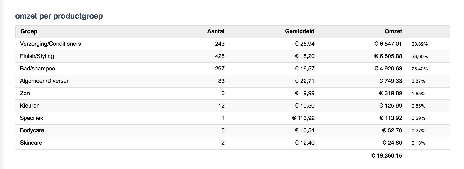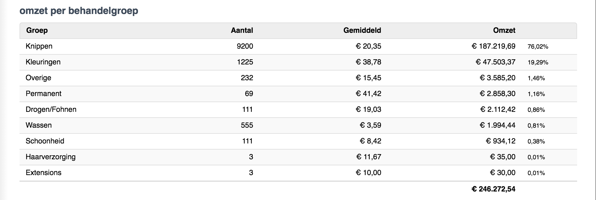 De omzet is opgedeeld per behandelgroep (zoals knippen, kleuringen, extensions, etc.) en per productgroep (zoals shampoo en conditioners).
