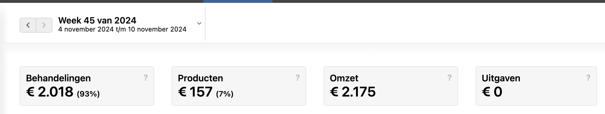 De omzet is uitgesplitst in Behandelingen en in Producten waarbij de percentages zijn vermeld. Dat is handig om snel te zien wat het verkooppercentage van een medewerker is.