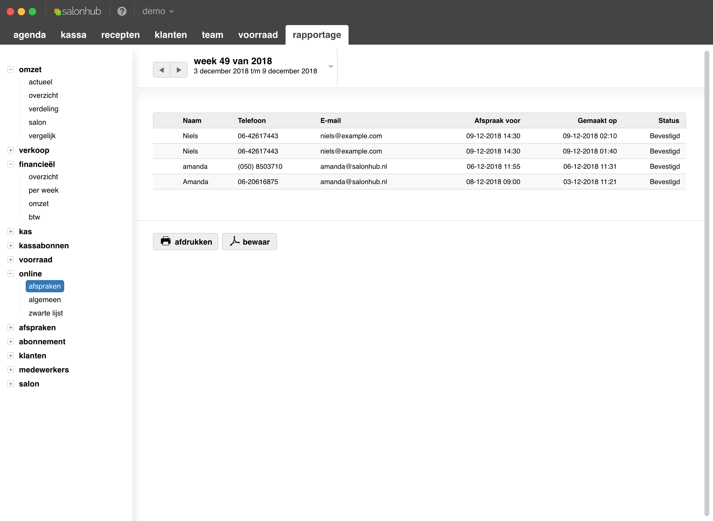 Op salonniveau is in Rapportage – Online – Afspraken de tijdsvolgorde van online geboekte afspraken zichtbaar. Hierbij worden ook het e-mailadres en telefoonnummer van de klant weergegeven.