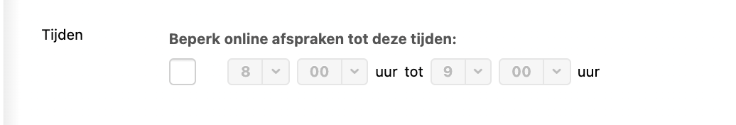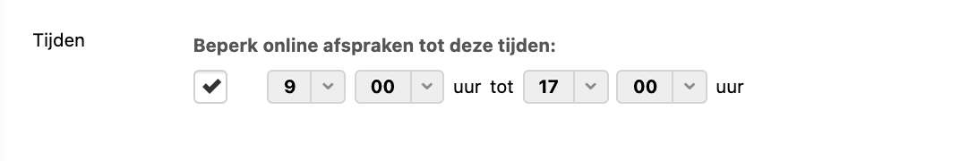 Klik de checkbox aan en kies er bijvoorbeeld voor om alleen in de ochtend online afspreken mogelijk te maken. Voer de tijden in waar klanten online hun afspraak kunnen inboeken. Hoeft online afspreken niet beperkt te worden vul hier dan niets in en laat de checkbox leeg.