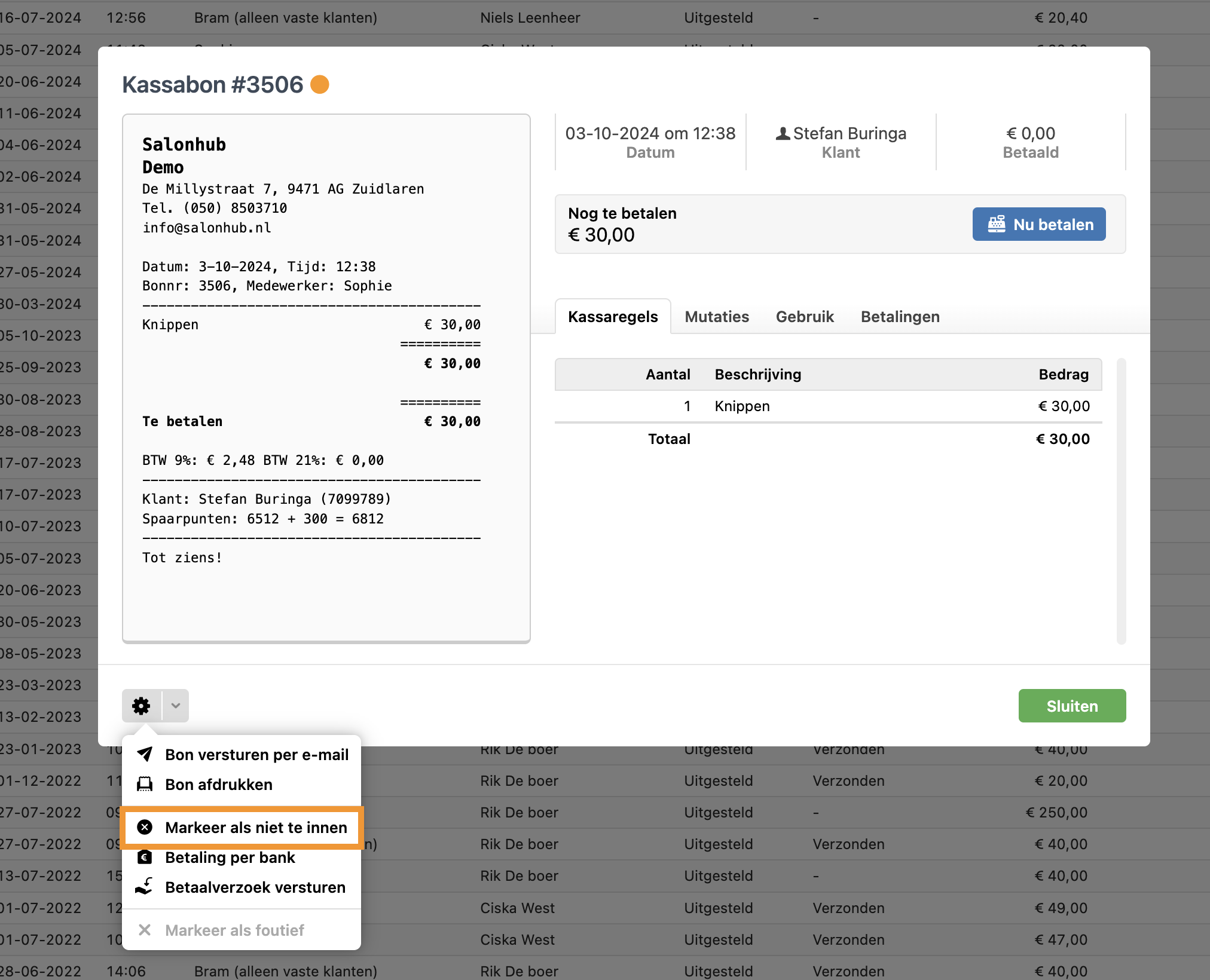 Hiermee wordt de onterecht geregistreerde bon uit de openstaande lijst verwijderd en correct verwerkt in Salonhub.