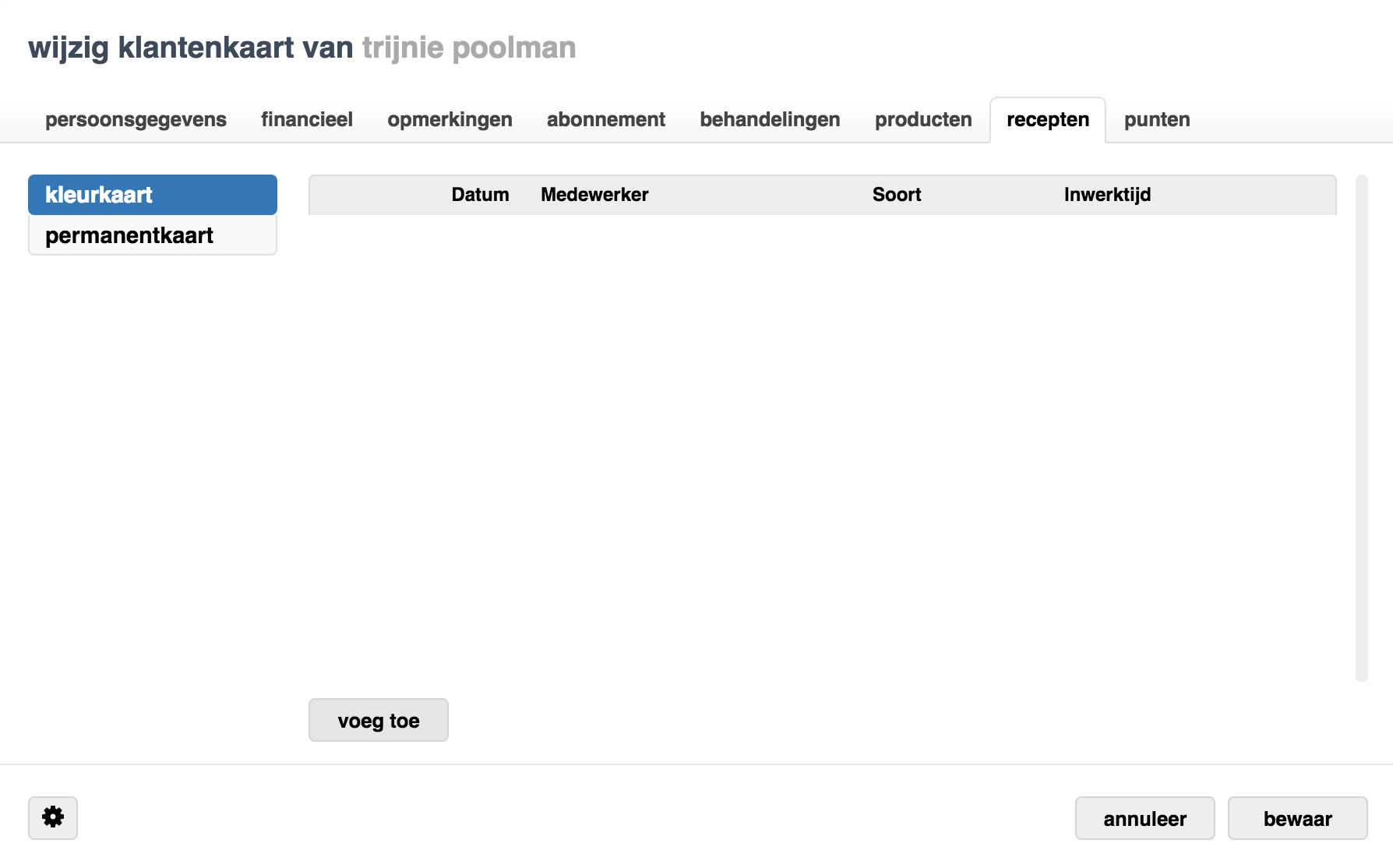 Ook is het mogelijk om recepten rechtstreeks via de klantenkaart bij te werken. Ga op de klantenkaart naar het tabblad Recepten en klik op de knop Voeg toe.