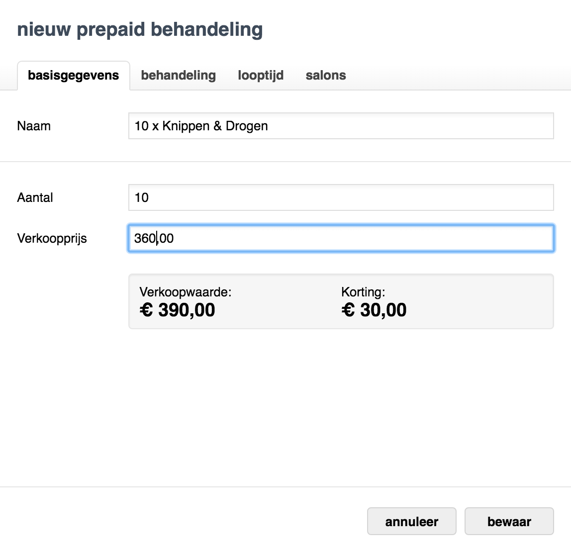 Kies een duidelijke naam voor het abonnement, zoals “20x Wassen Föhnen”, zodat deze eenvoudig terug te vinden is. Vul vervolgens het aantal bezoeken en de verkoopwaarde van het abonnement in. Wanneer je in het tabblad Behandelingkiest voor de specifieke behandeling, wordt automatisch weergegeven of er een korting van toepassing is en wat de waarde hiervan bedraagt.