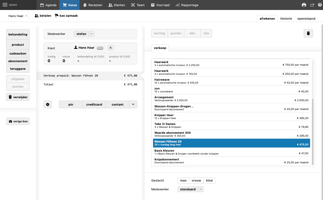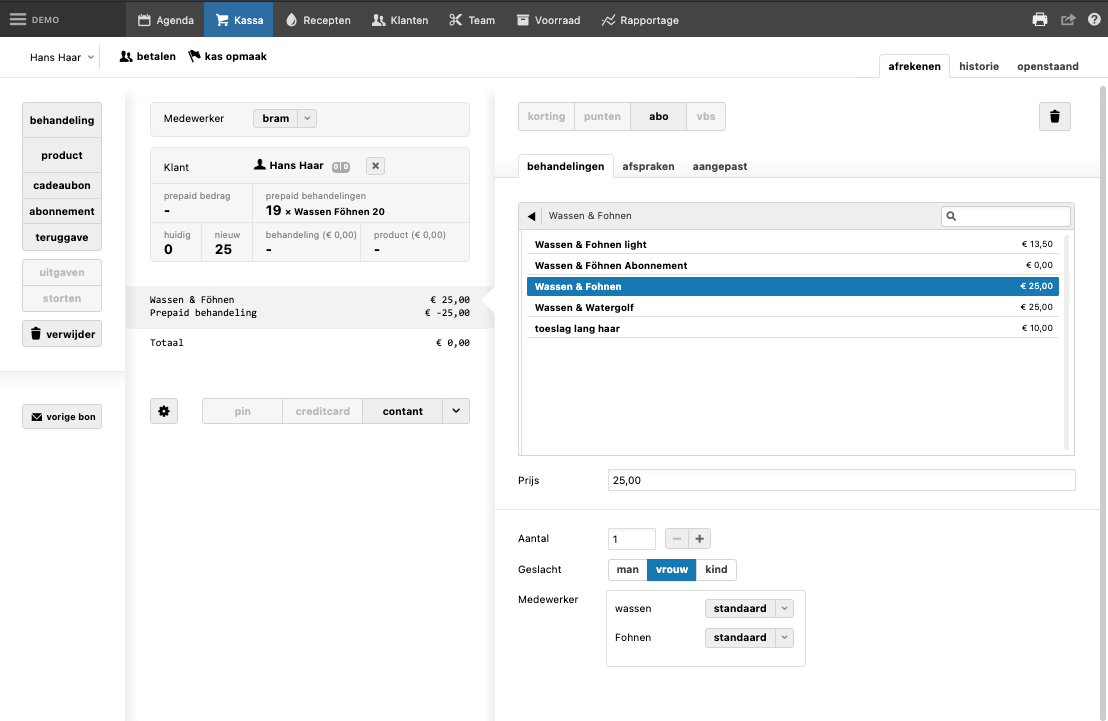 Ga naar Kassa en selecteer de medewerkernaam en de klantnaam. Klik vervolgens op de knop Abonnement aan de linkerkant van het scherm. Aan de rechterkant kan het desbetreffende abonnement worden geselecteerd. Kies daarna een betaalmethode en bevestig de betaling als Voldaan.