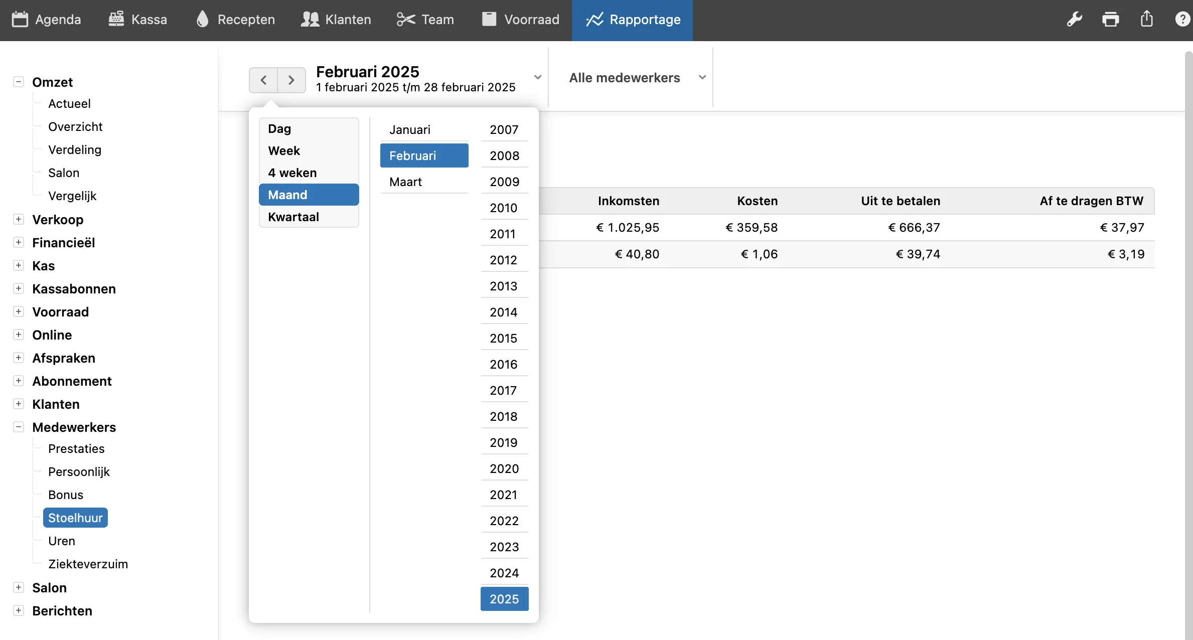 Bij Rapportage Medewerkers Stoelhuur wordt een overzicht van alle stoelhuurders weergegeven. Er kan gekozen worden voor een Stoelhuuroverzicht weergave per dag, week, 4 weken of maand. Dit betreft alle medewerkers van het type Stoelhuurder.