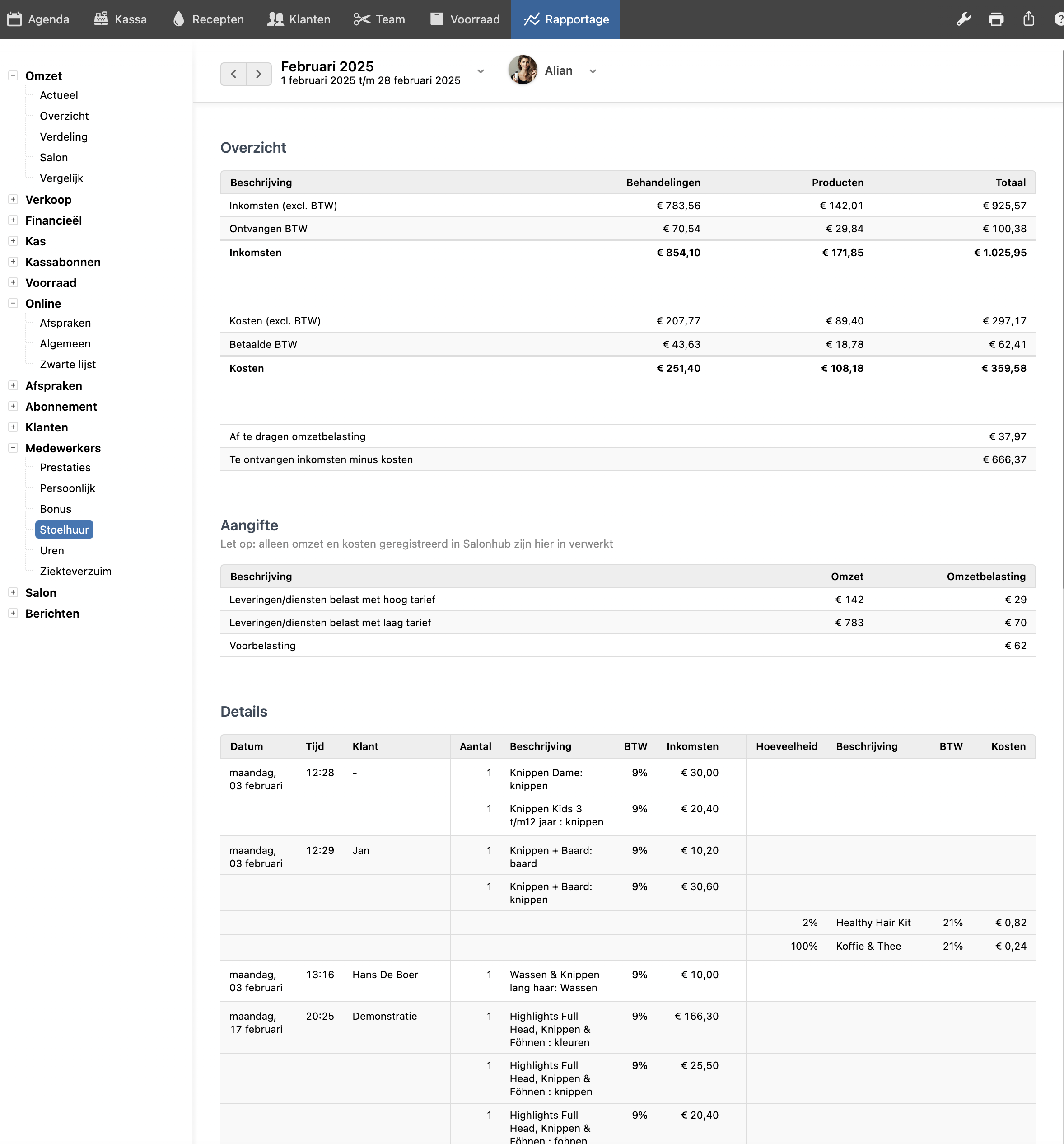 Een gedetailleerd rapport met bovenaan een overzicht van de omzet uit behandelingen en producten, de ontvangen BTW, de gemaakte kosten en de betaalde BTW.