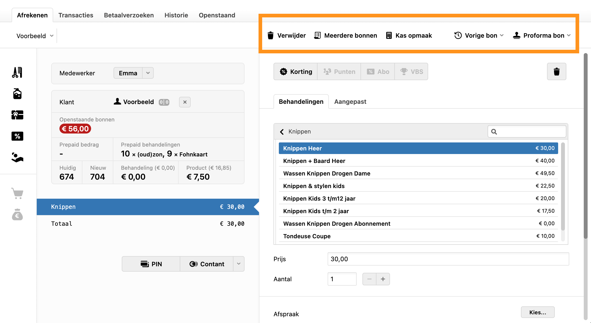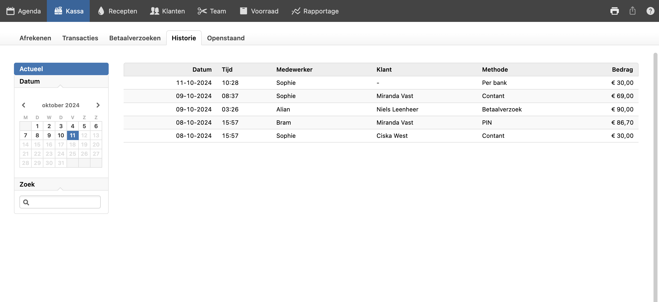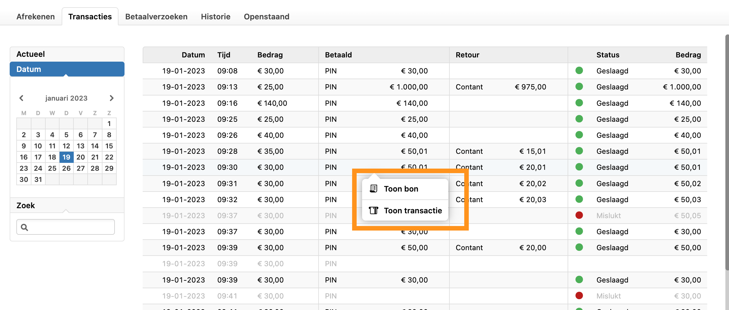 Deze functie biedt inzicht in alle transacties die zijn voldaan via pin, contant of andere betaalmethode