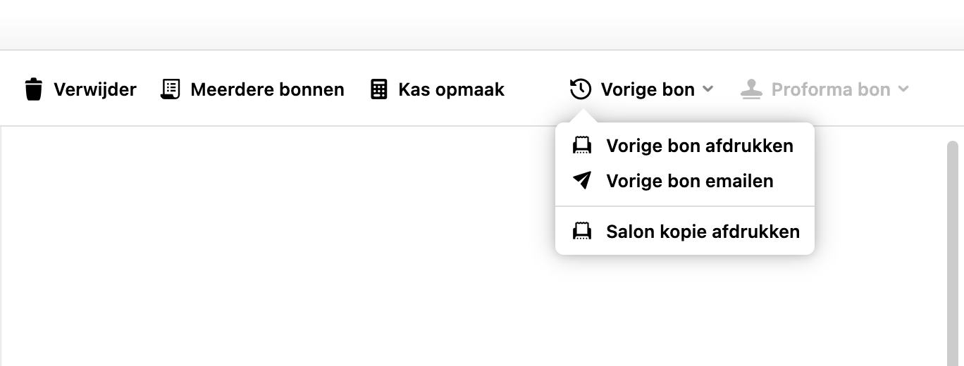 Vorige bon zijn de functies afdrukken, e-mailen en Salon kopie afdrukken zichtbaar
