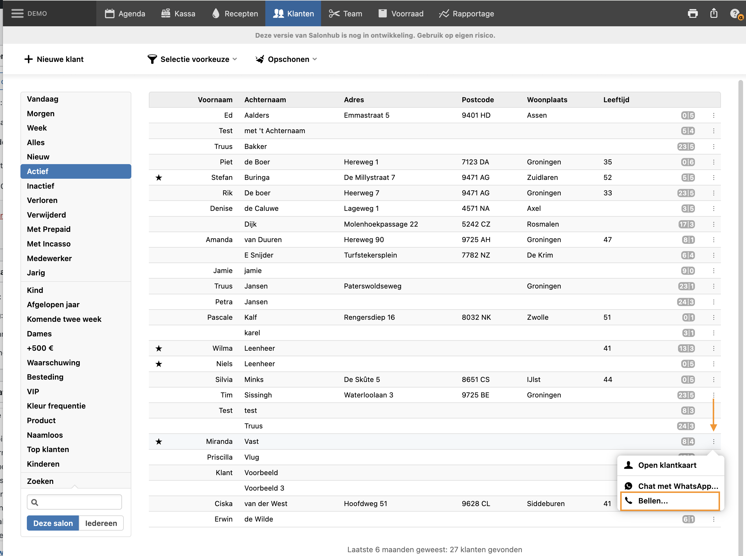 Tabblad Klanten: Klik op de drie stipjes achter de naam van de klant om een telefoongesprek te starten.